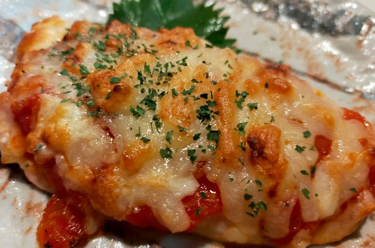 朝引き鶏のササミを生地に見立てて、トマトソースやチーズを乗せてオーブンで焼いています。
